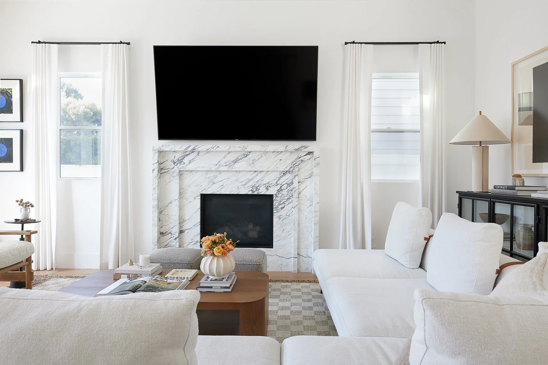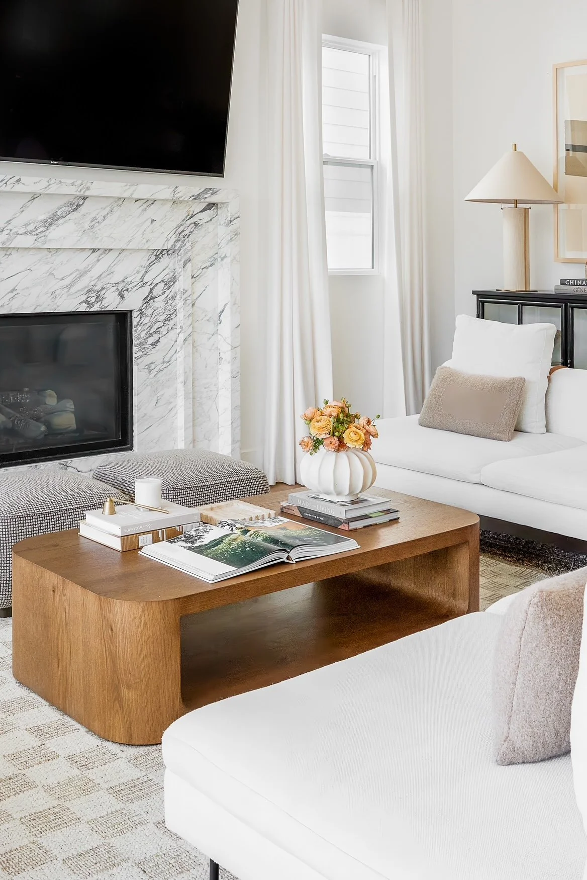We created this sophisticated and functional space through performance fabrics and durable pieces that will hold up over time. The basic builder fireplace was also elevated with a custom marble fireplace surround. These elements provide a beautiful background for this busy young family!